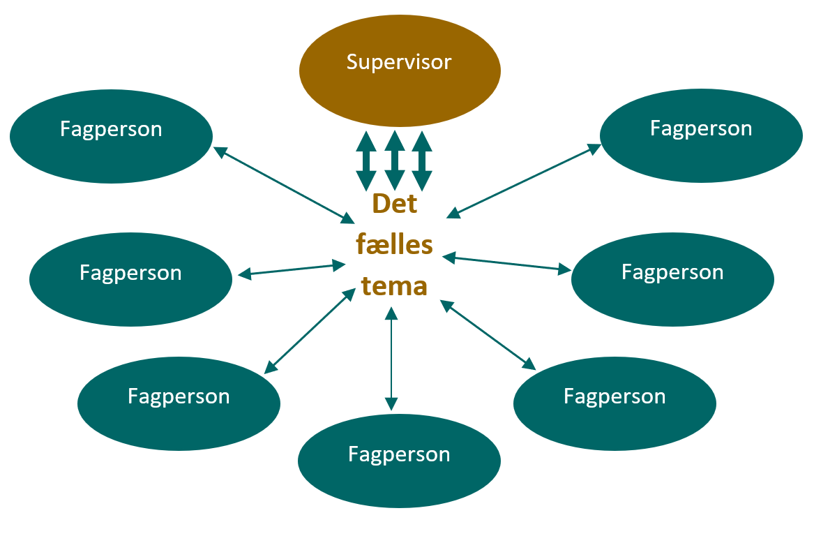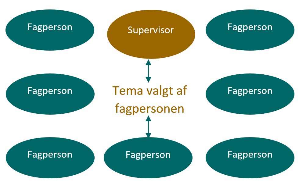 - Ved supervision i gruppe er temaet valgt af en enkelt fagperson og det er denne fagperson, som supervisor arbejder dialogisk med. Der vil ofte også opstå læring og udvikling ved de kollegaer, som ikke selv har et tema til supervision og i stedet er observatør eller reflekterende team under supervisionen.